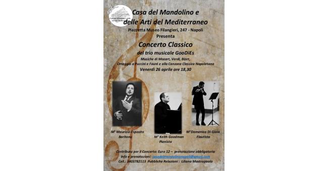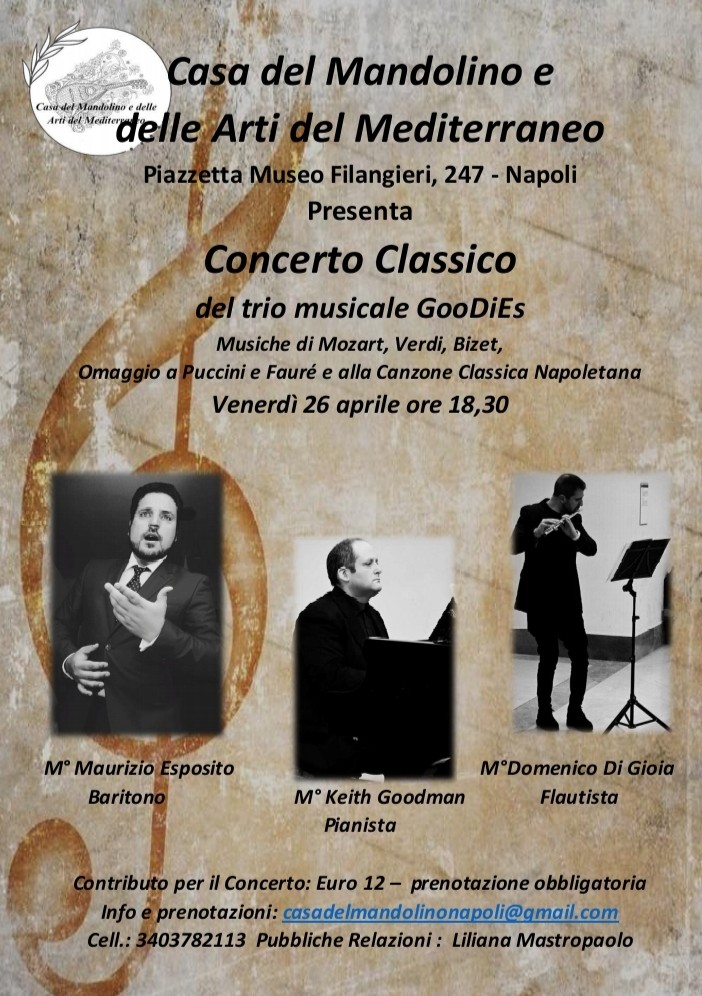 Un Concerto dedicato a Capolavori della Musica Classica alla Casa del Mandolino e delle Arti del Mediterraneo con il Trio GooDiEs, nome che nasce dalle iniziali del cognome dei Maestri che lo compongono: M° Maurizio Esposito, baritono, M° Keith Goodmam, pianoforte e M°Domenico Di Gioia , flauto e che significa " prelibatezze, chicche".