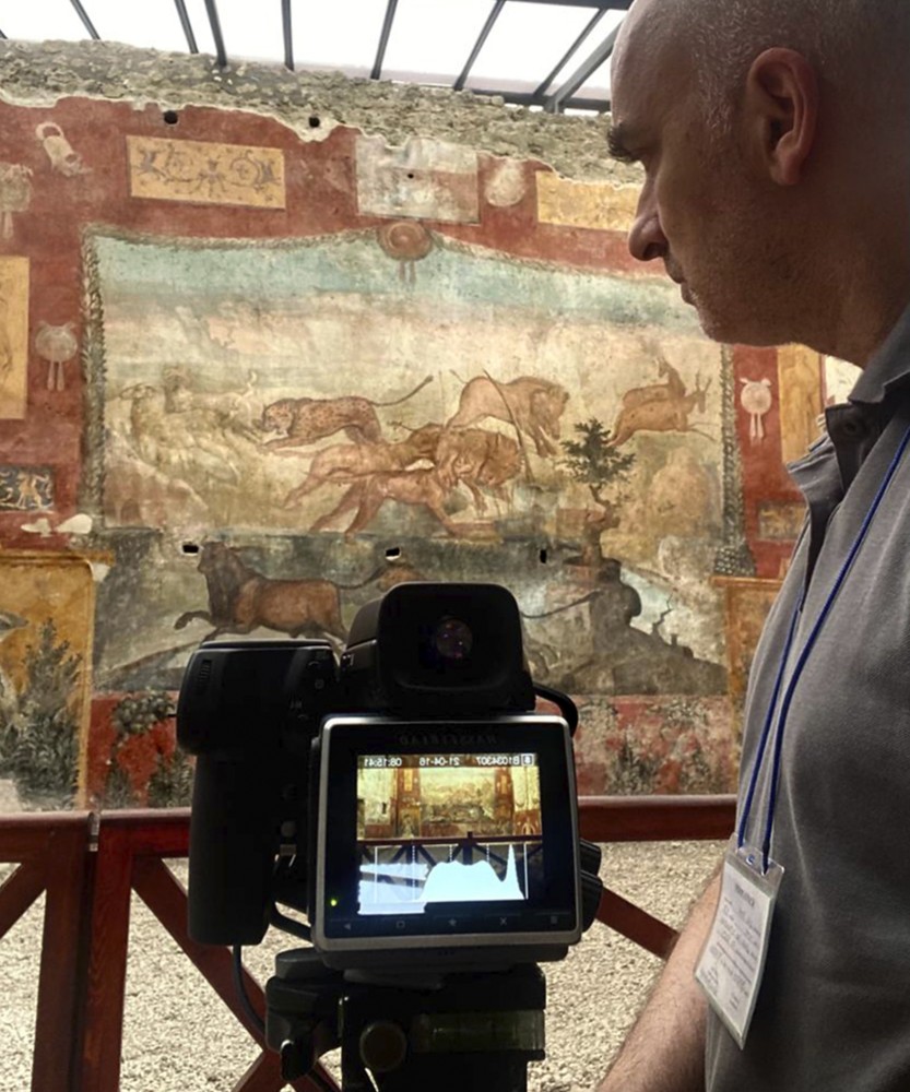 Osservando da vicino i mosaici, percorrendo peristili, riscoprendo ogni particolare delle pitture parietali, Spina ha poi selezionato sessanta interni: fotografie dove le domus riemergono in una visione inedita, in un equilibrio ambientale che restituisce da una parte la dimensione della presenza umana, dall’altra la vastità dell’Impero romano, rievocando allo stesso tempo l’antica tragedia di Pompei.