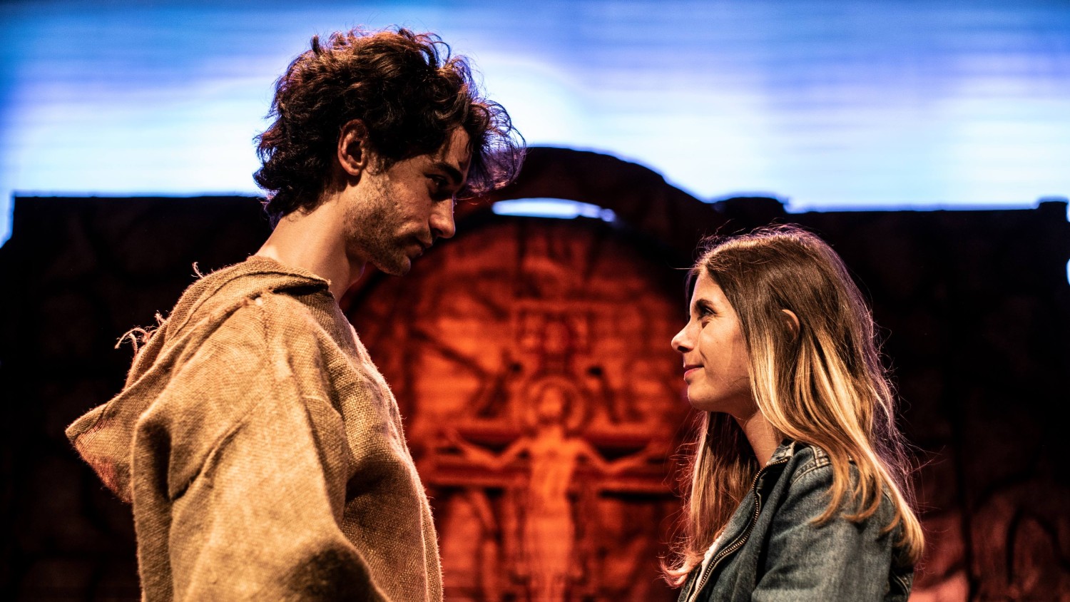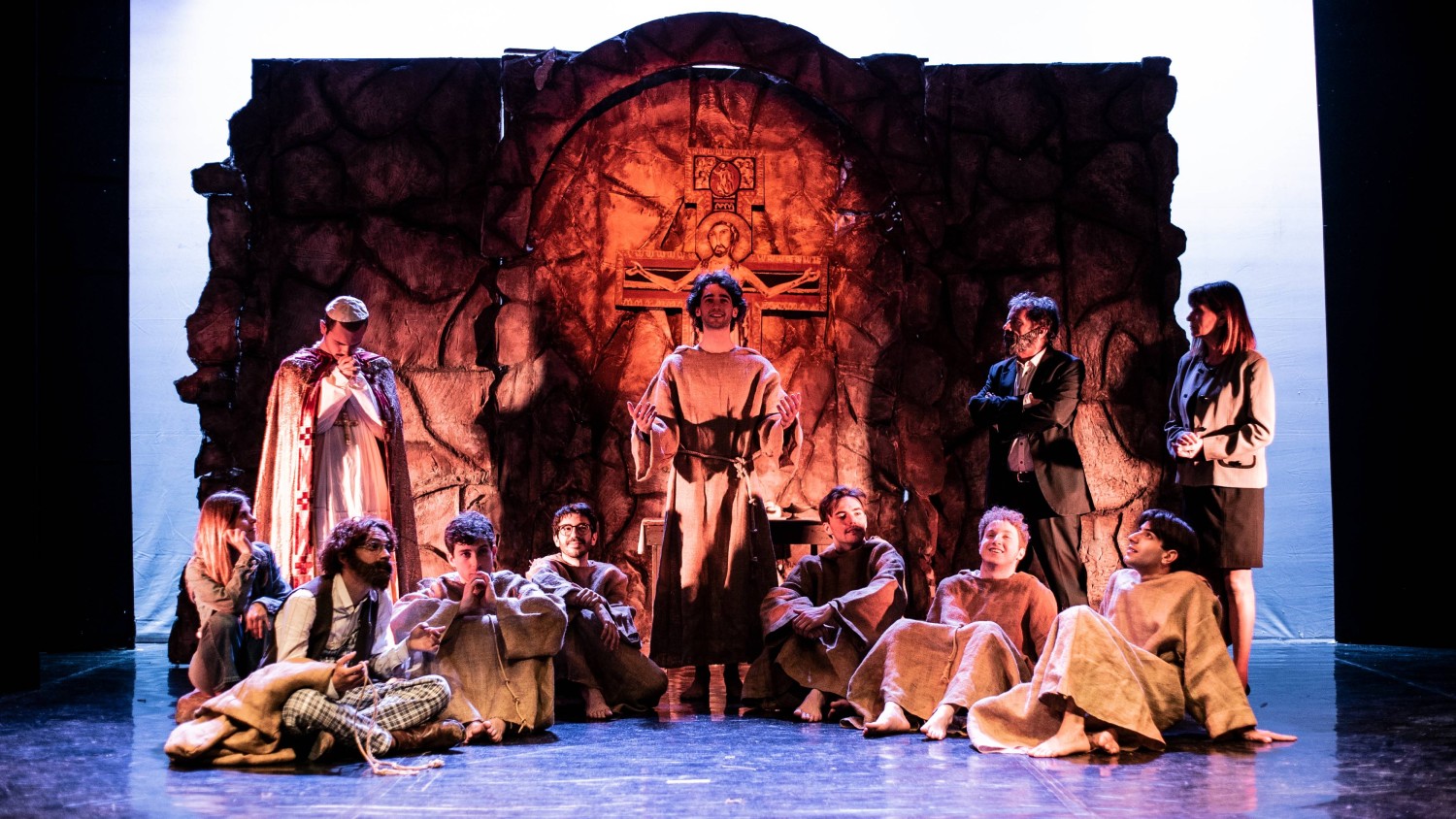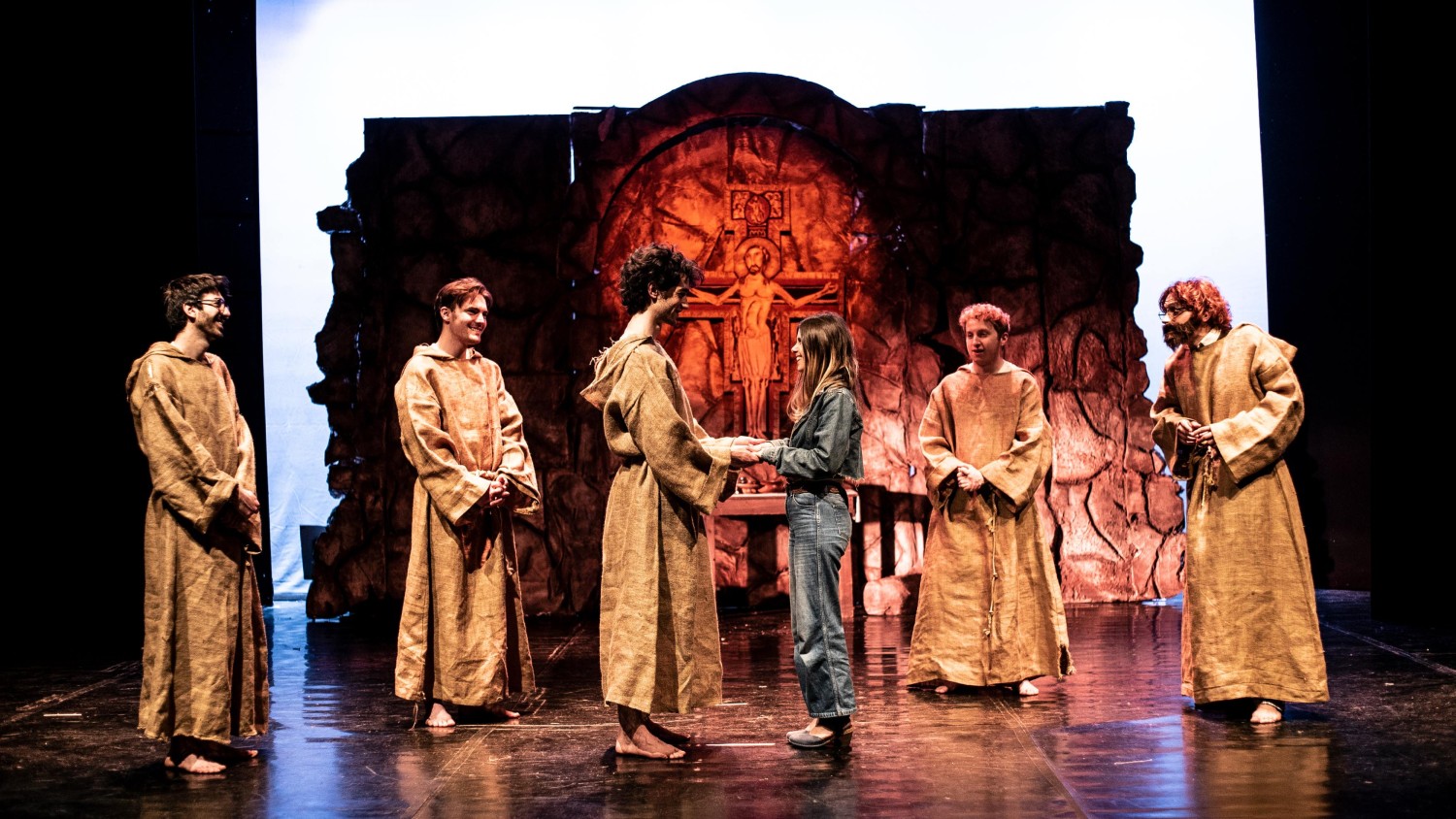 Solo una scenografia che definisco “tradizionale” fa da sfondo in alcune scene dello spettacolo: rappresenta i ruderi della splendida chiesetta di San Damiano, ad Assisi, la chiesetta che Francesco decise di ricostruire con i suoi amici frati e che per anni è stato il loro amato rifugio.