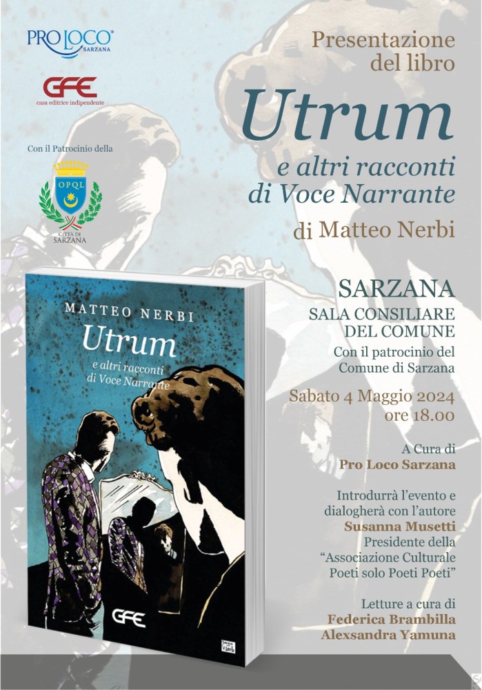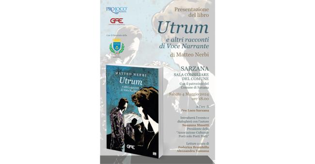 L’autore toscano Matteo Nerbi sabato 4 maggio alle ore 18.00 sarà a Sarzanaper presentare il suo libro “Utrum e altri racconti di Voce Narrante” uscito di recente con Edizioni GFE di Roma.