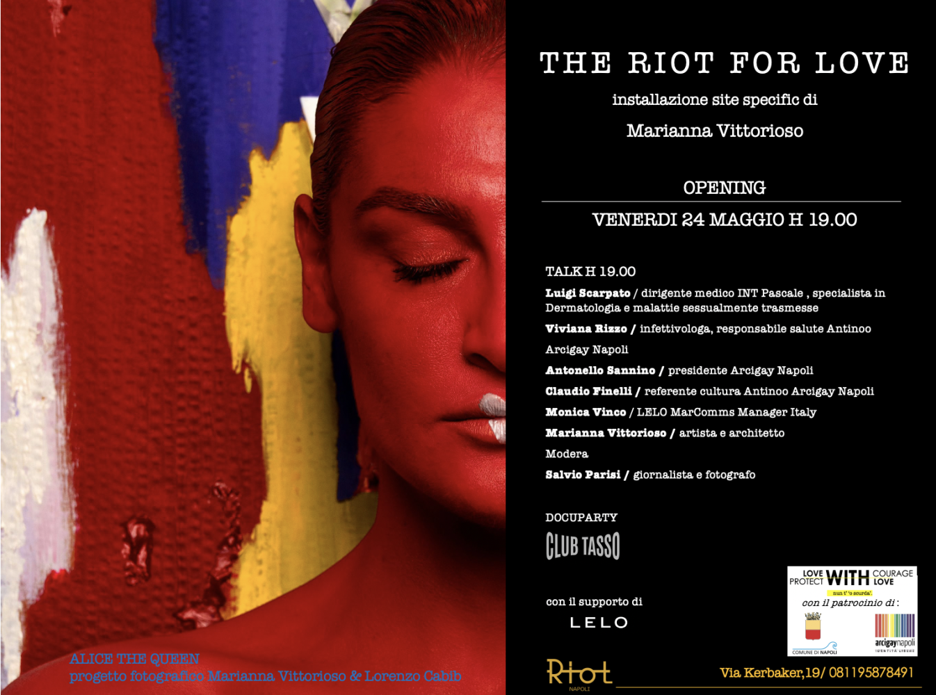 Con il Riot si inaugura la seconda tappa di un percorso espositivo - partito da Centro Storico napoletano con il lounge bar Tools - inserito in “Love with courage / protect with love…non t’‘o scurdà”, progetto diffuso che mira a creare in ogni quartiere del territorio cittadino una mappa di free condom point, con particolare attenzione ai luoghi più frequentati dai giovani.