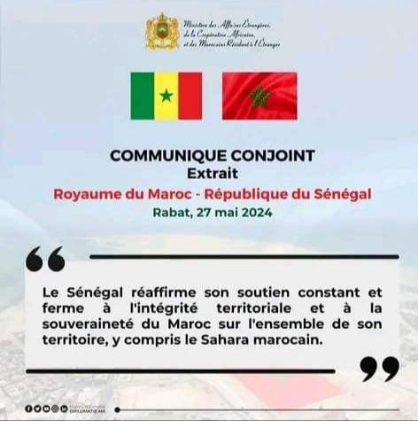 Questa posizione è stata espressa nel Comunicato Congiunto pubblicato in seguito ai colloqui, lunedì 27 maggio nella capitale del Marocco, Rabat, tra il Ministro degli Affari Esteri, della Cooperazione Africana e dei Marocchini all'Estero, Nasser Bourita, e Yassine Fall, che effettua la sua prima visita nel Regno come ministro senegalese dell'Integrazione Africana e degli Affari Esteri.