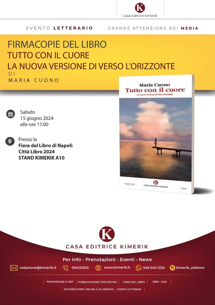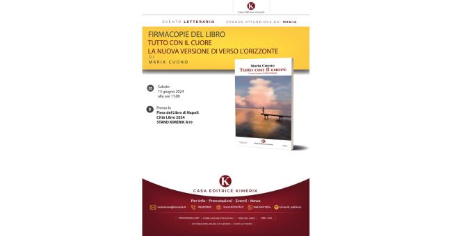 Sabato 15 giugno alle ore 11.00 la giornalista e scrittrice Maria Cuono sarà presente per il firmacopie del libro Tutto con il cuore. La nuova versione di Verso l’Orizzonte, edito dalla Casa Editrice Kimerik, presso la Fiera del Libro di Napoli, allo Stand Kimerik A10. La prefazione è a cura del soprano Olga De Maio.