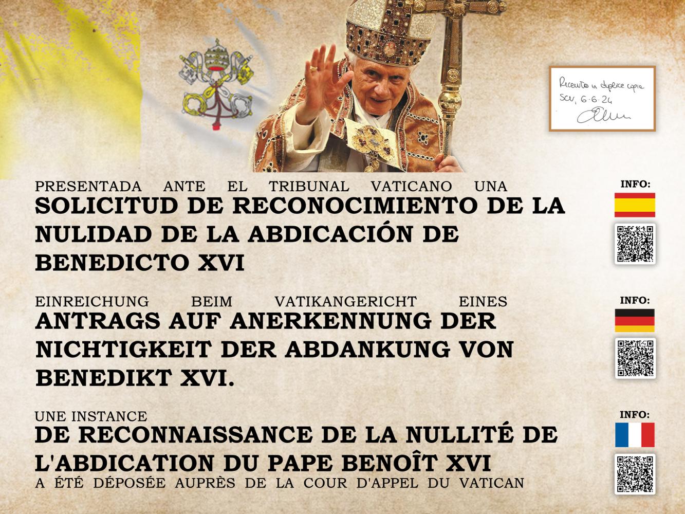 Così, nella mattina di giovedi 6 giugno 2024, chi scrive, tramite un suo legale, ha depositato presso il Tribunale dello Stato della Città del Vaticano, una “Istanza per il riconoscimento della nullità dell’abdicazione di papa Benedetto XVI”. Secondo i “Diritti e i doveri” dei fedeli, infatti, qualsiasi battezzato può presentare al foro ecclesiastico competente delle legittime richieste di chiarimenti.