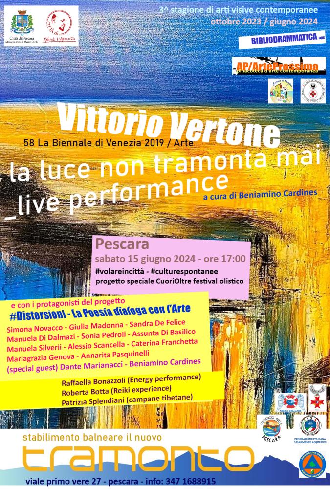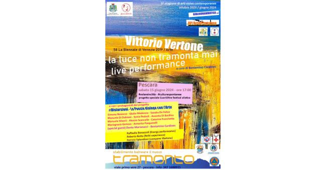 Sabato 15 giugno dalle ore 17:00, presso lo Stabilimento Balneare “Il nuovo Tramonto” a Pescara sud (Via Primo Vere 27), live performance on the beach con Vittorio Vertone già ospite della 58 Biennale di Venezia Arte 2019, e di ritorno da una prestigiosa mostra nell’ambito della Biennale Venezia 2024, oggi considerato il più grande artista della Basilicata contemporanea.