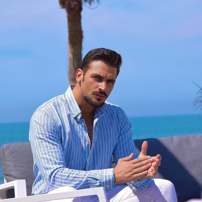 Mariano Catanzaro e' bellissimo.Nel pieno dei suoi magnifici trent'anni sfodera con consapevolezza il suo enorme sex-appeal. Abbronzato,tutto in bianco lascia senza fiato.