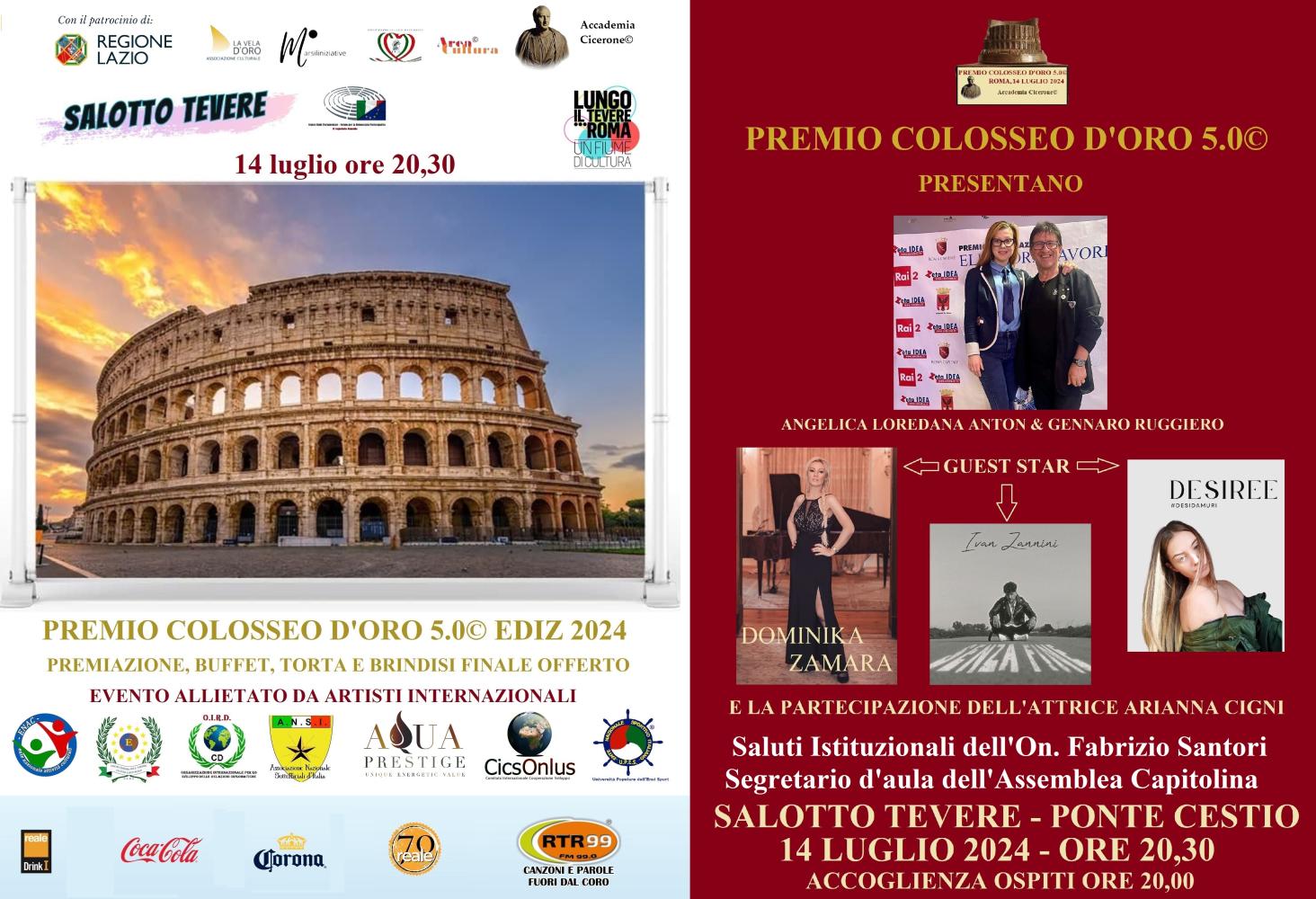 La cerimonia di premiazione del Premio Colosseo d'Oro 5.0 si terrà per la prima volta nella splendida cornice del Salotto Tevere, situato sulle banchine di Ponte Cestio. L’evento, previsto per il prossimo 14 luglio, inizierà alle ore 20:00 con un aperitivo, seguito dall'inizio ufficiale della cerimonia alle 20:30.