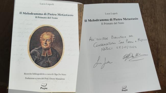 La prestigiosa e storica Biblioteca del Conservatorio San Pietro a Majella di Napoli ha accolto tra le sue preziose opere in questi giorni il saggio su Metastasio, Il Melodramma di Pietro Metastasio il Primato del Testo" di Luca Lupoli ,con le ricerche biobliografiche di Olga De Maio, casa Editrice Pagine, che si aggiunge a quello dedicato al musicista partenopeo Mario Persico e la sua produzione operistica dello scorso anno.
