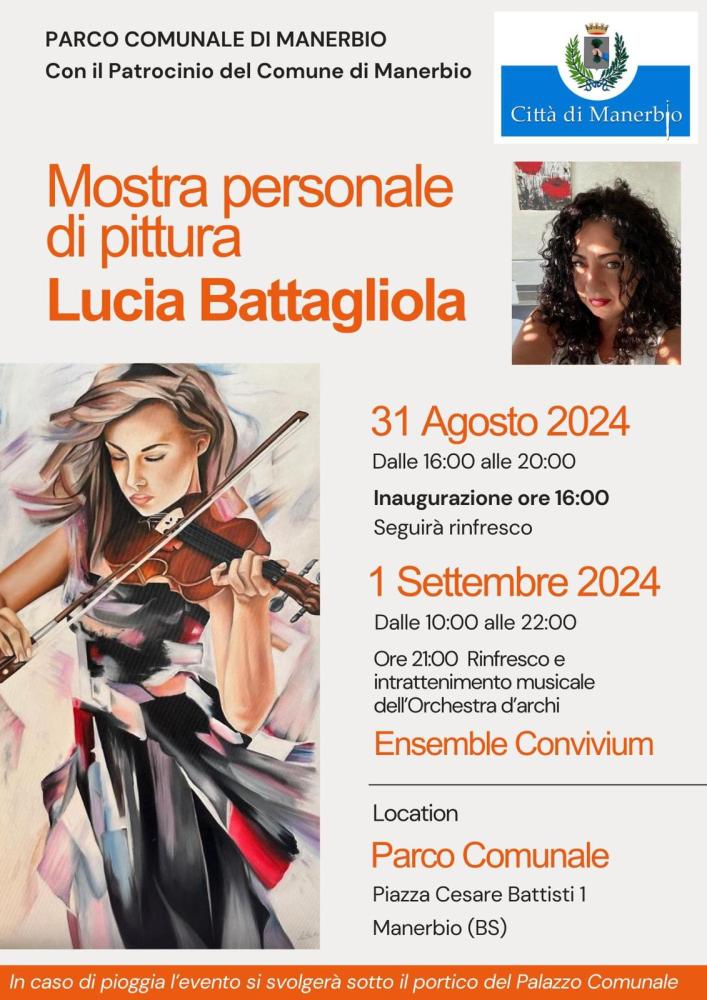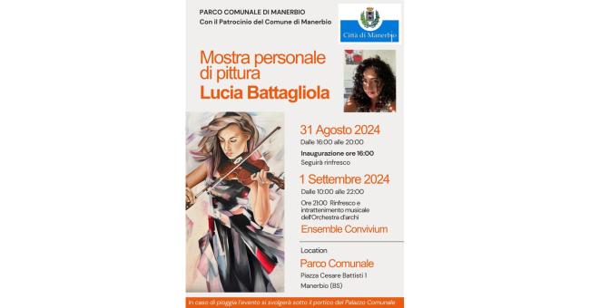 La talentuosa pittrice Lucia Battagliola, in arte LuBa, inaugurerà la sua mostra personale nei giorni 31 agosto e 1° settembre 2024 presso lo storico Parco Comunale di Piazza Cesare Battisti di Manerbio (BS).