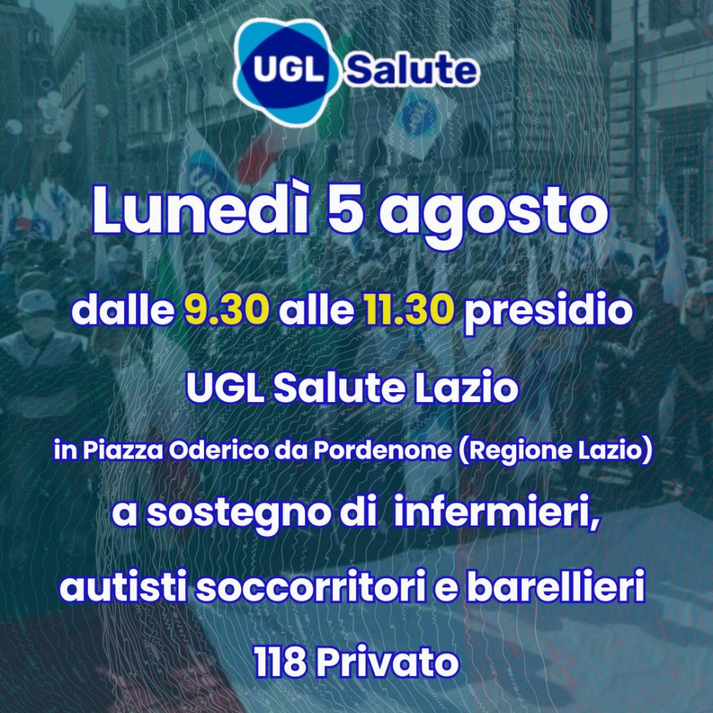 “Lunedì 5 agosto, dalle ore 9.30 alle 11.30, la UGL Salute sarà difronte alla Regione Lazio, in Piazza Oderico da Pordenone a Roma, per protestare contro la decisione che può portare al licenziamento di numerosi autisti e barellieri” dichiarano in una nota il Segretario Nazionale Gianluca Giuliano e il Segretario UGL Lazio Armando Valiani.