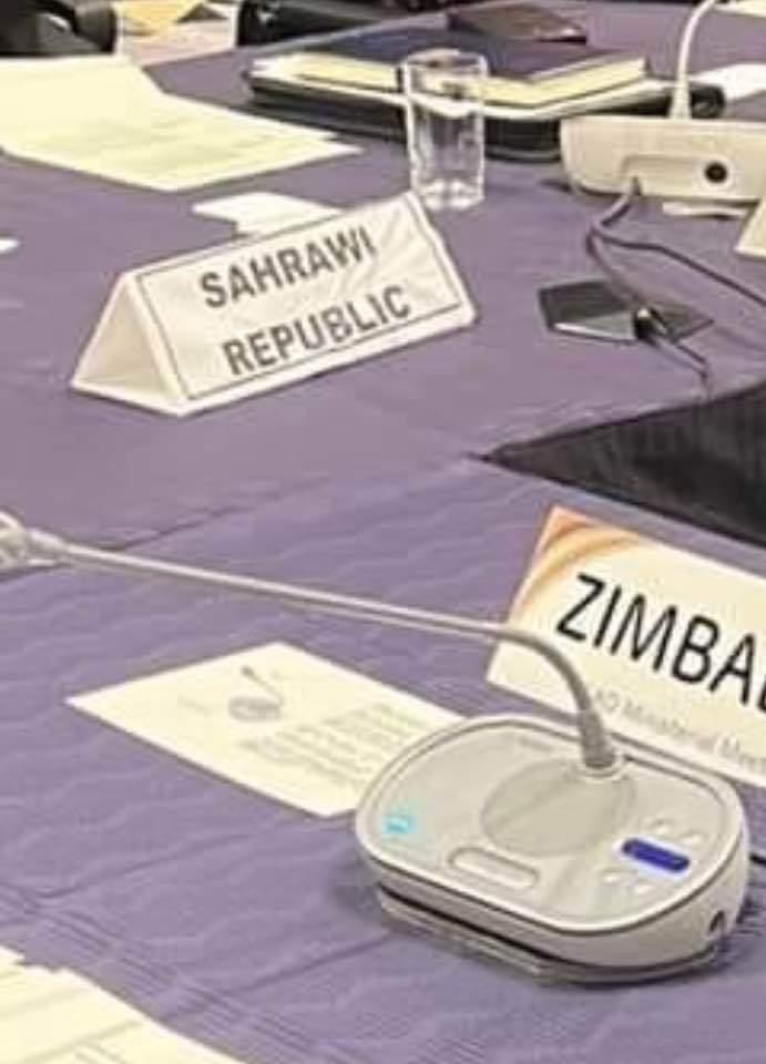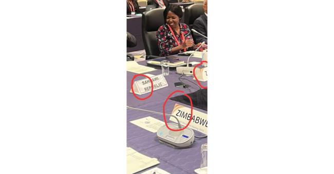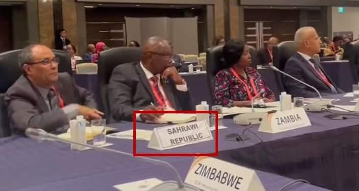 Un separatista del gruppo Polisario, appena entrato, sotto lo sguardo attento del capo della delegazione algerina, ha cercato un angolo vuoto del tavolo vicino alla delegazione del Zimbabwe. Si siede lì, sistema le sedie, guarda un po' a sinistra, un po' a destra, prima di tirare fuori un cartello dallo zaino con il nome dell'entità fantasma e lo ha appoggiato clandestinamente sul tavolo (vedi video), in una tipologia scomoda che non ha alcuna somiglianza con quella delle altre delegazioni. Anche la sua bottiglia d'acqua e il bicchiere non sono per nulla simili a quelli degli altri.