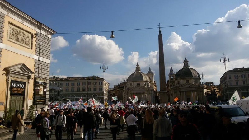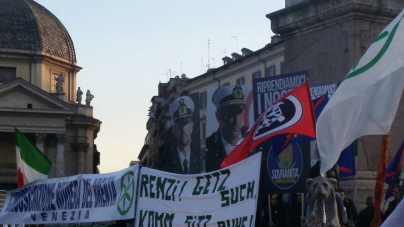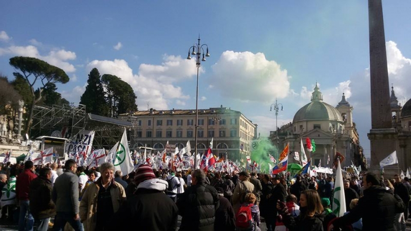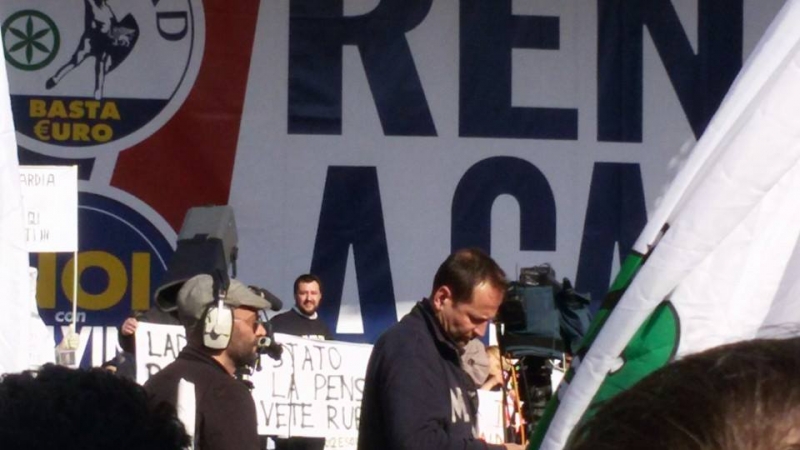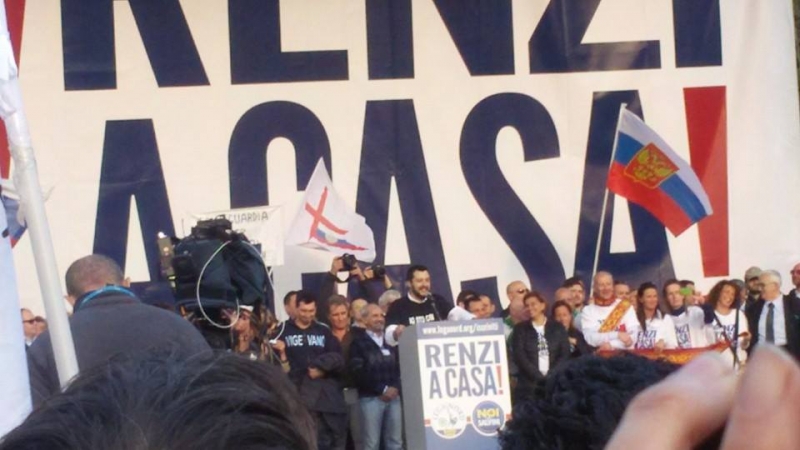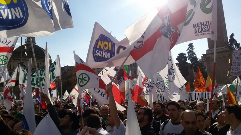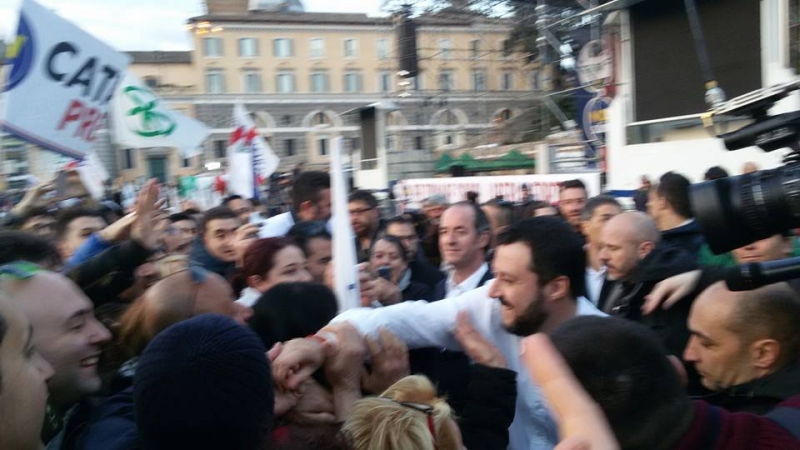 Piazza del Popolo alle 15 si sta riempiendo come nelle grandi manifestazioni. In attesa dell'apertura del comizio, sotto il palco con i simboli della Lega e lo slogan "Renzi a casa", i sostenitori della Lega sventolano bandiere, alzano striscioni e lanciano cori di protesta contro il Presidente del Consiglio: "Renzi Renzi vaffa....." Qualche minuto dopo le 15 il comizio sta per iniziare e alla vista della piazza gremita, Salvini sorride dal palco e saluta i militanti: "Buon pomeriggio Roma. Siete 100mila, voglio veder tremare l'obelisco".