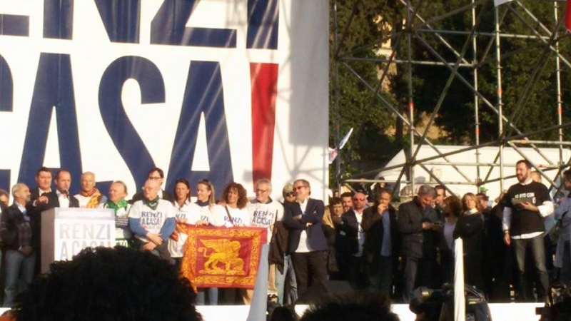 All'inizio del comizio sul palco salgono i sindaci veneti, poi uno dopo l'altro, si alternano al microfono le categorie che il Carroccio vuole rappresentare: gli artigiani, gli studenti, i poliziotti, gli esodati, i medici, gli agricoltori, i pescatori e poi le forze politiche: l'estrema destra di CasaPound, che con il leader Di Stefano sposa tutti i punti del progetto politico di Salvini, poi prende la parola Giorgia Meloni e dopo, finlmente, l'atteso intervento del segretario del Carroccio, Matteo Salvini che chiede alla grande piazza: "Perché ogni volta che dico Renzi, dite vaffanculo? - e continua - Il problema non è lui, Renzi è una pedina, è il servo sciocco a disposizione dell'Unione Europea".