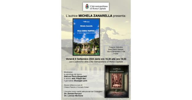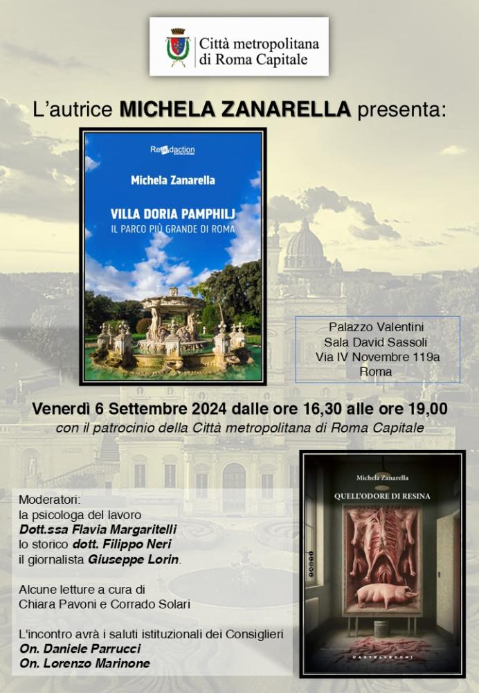 Venerdì 6 settembre 2024 dalle ore 16.30 alle ore 19 nella sala David Sassoli di Palazzo Valentini a Roma in via IV novembre 119a l’autrice Michela Zanarella presenta il romanzo “Quell’odore di resina” edito da Castelvecchi e il saggio “Villa Doria Pamphilj il parco più grande di Roma” edito da Readaction Editrice. L’incontro, con il patrocinio della Città metropolitana di Roma Capitale, avrà i saluti istituzionali dei Consiglieri On. Daniele Parrucci e On. Lorenzo Marinone. Moderano l’incontro la psicologa del lavoro D.rssa Flavia Margaritelli, lo storico dott. Filippo Neri, il giornalista Giuseppe Lorin. Alcune letture sono a cura degli attori Chiara Pavoni e Corrado Solari.