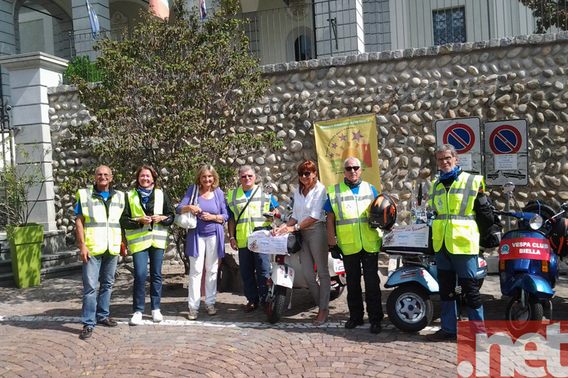 Stanno arrivando Carlo, Domenico e Giuseppe. Prova caschi arrivagi ieri sera alle 18. Bene anche questi. Adesivi sulle fiancate e sul parafango. Si parte per il luogo della partenza. Via Duomo. Ci aspettano gli amici del vespa club Biella e del moto club Perazzone insieme ad Andrea del Caffettino che hano preparato la partenza. Qualche problema con i vigili per i permessi ma tutto si aggiusta. Arriva anche don Gariazzo che benedice le vespa e il sindaco per dare il via al giro. Vi è anche il consigliere Posillipo del comune di Santhia che tantissimo ha fatto per il nostro arrivo del 6 ottobre.