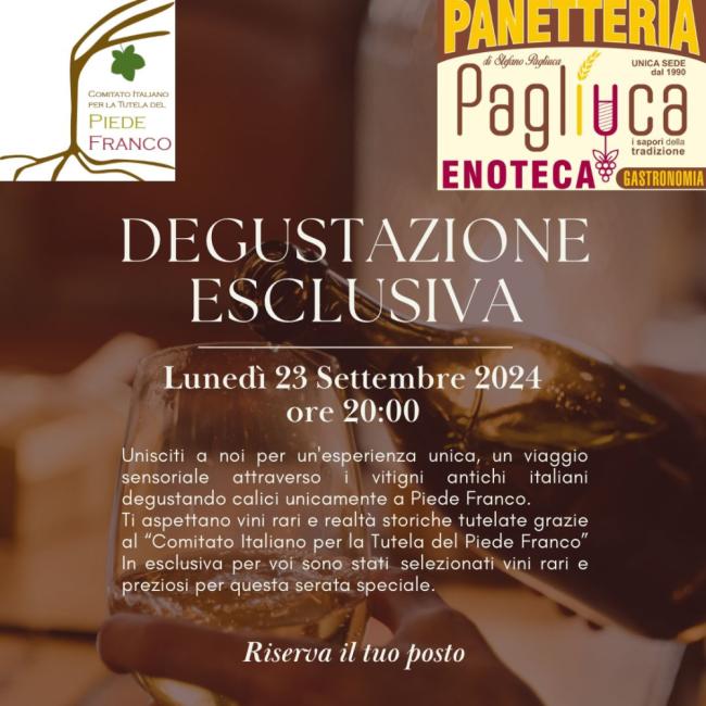 Lunedi 23 settembre alle ore 20:00 presso l’Enopanetteria i sapori della tradizione di stefano Pagliuca in Croso Europa, 125 a Melito di Napoli verrà presentata al pubblico una degustazione esclusiva di vini a cura del Comitato Italiano per la Tutela del Piede Franco.