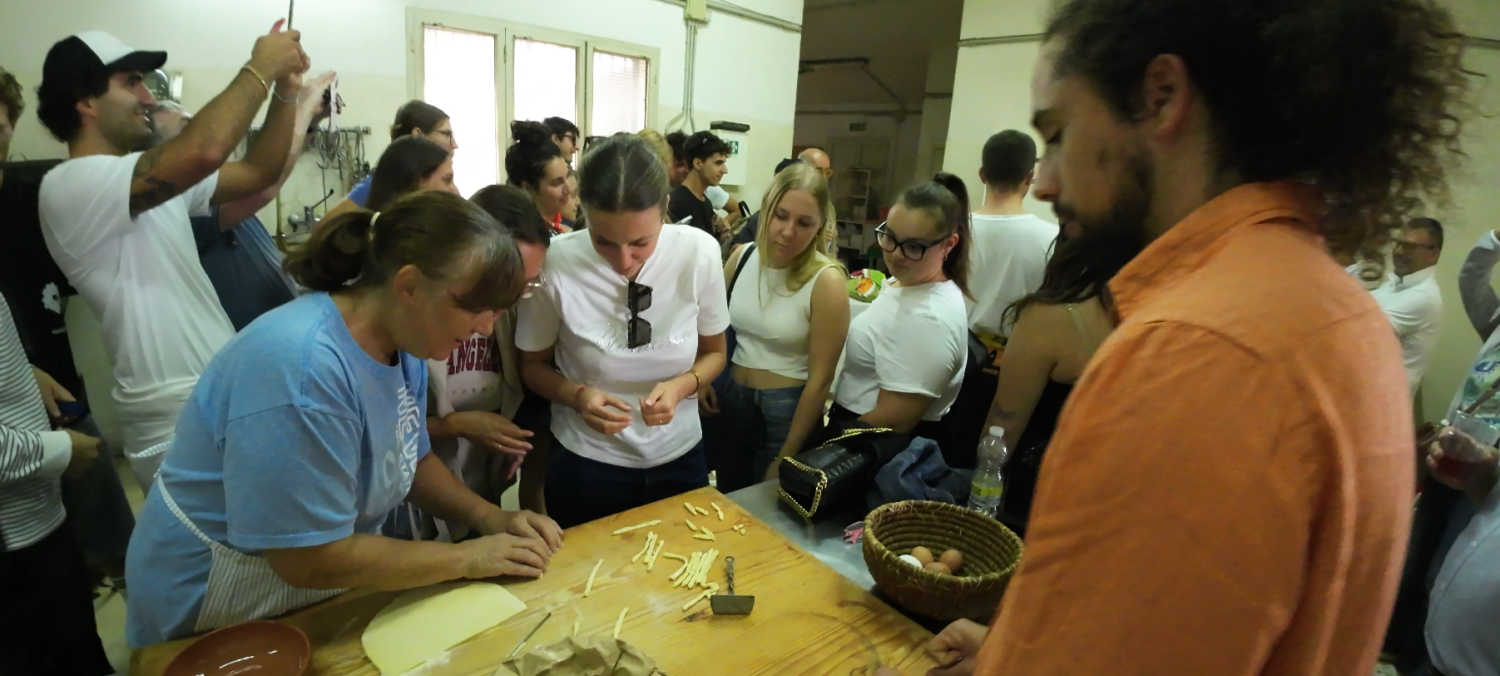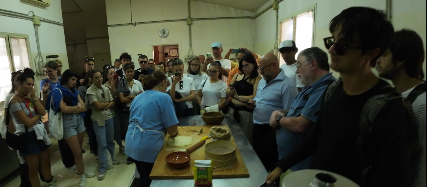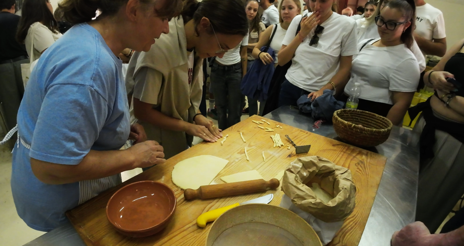 Gli ospiti sono stati accolti con un "aperitivo contadino" dalla signora Marilena, che ha offerto una dimostrazione sulla preparazione dell’impasto per la pasta fatta in casa, come i "ciufoli", fusilli e “cavatelli” a una, due o tre dita. Gli studenti, entusiasti, si sono cimentati nel tirare a mano questi formati di pasta, sperimentando l'antica arte della lavorazione manuale.