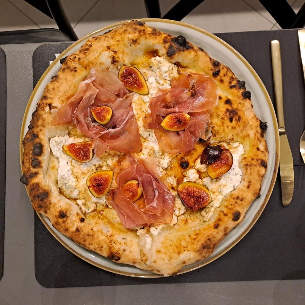 1. Affresco di Pompei: focaccia con base ricotta moretto razze italiane, fichi freschi, prosciutto crudo con salsa in agrodolce di datteri