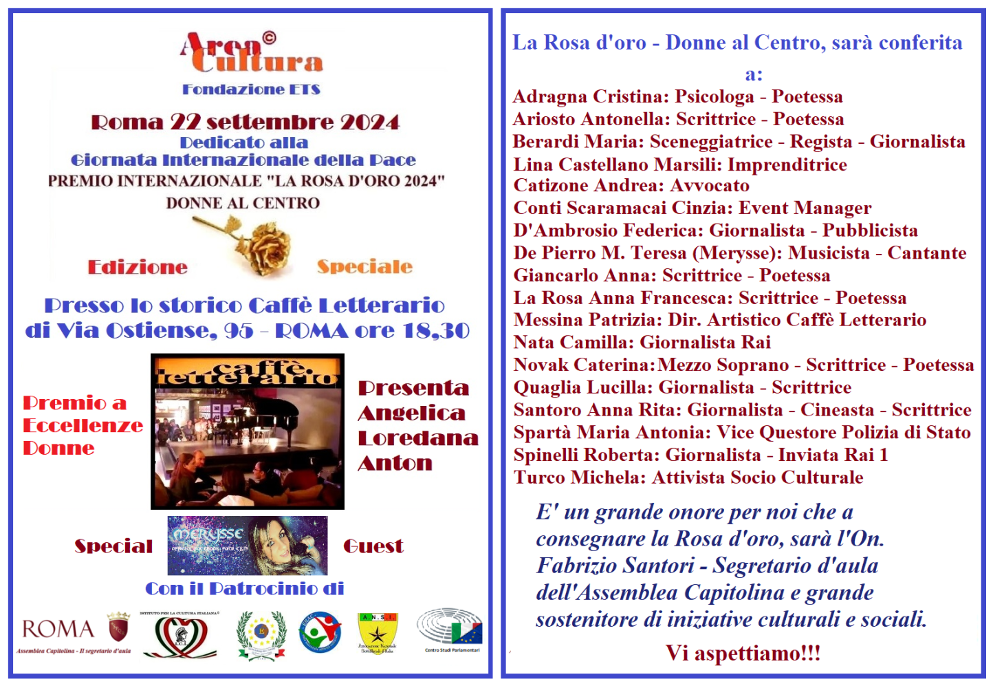 Il Premio Internazionale "La Rosa d'Oro - Donne al Centro" è un riconoscimento che celebra le donne che si sono distinte in vari settori della società, dal mondo accademico a quello artistico e professionale. L'iniziativa è promossa dalla Fondazione Area Cultura, presieduta dalla Dr.ssa Angelica Loredana Anton, giornalista, scrittrice e attrice, con l'obiettivo di sottolineare l'importanza del contributo femminile per una società più inclusiva ed equa.