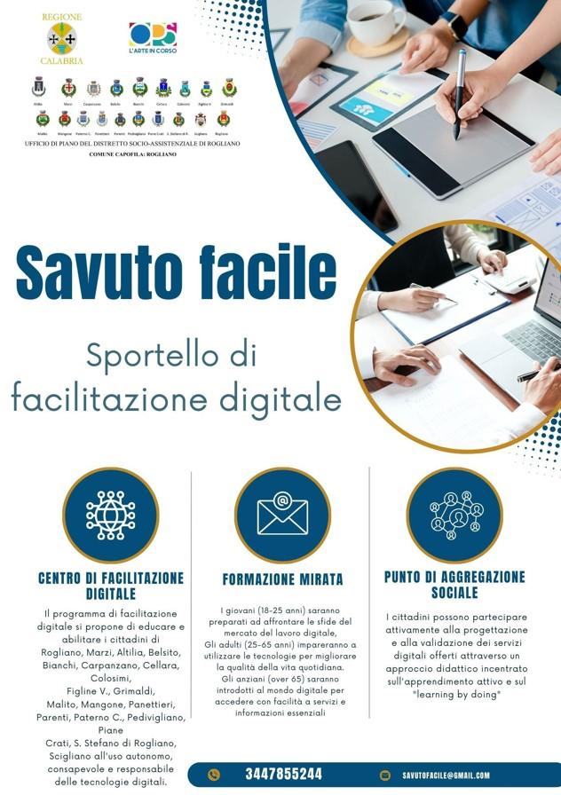 In risposta al persistente divario di alfabetizzazione digitale che affligge il nostro Paese, il progetto "Savuto Facile", approvato con la Delibera di Giunta Regionale n. 52 del 16 febbraio 2023, mira a istituire un centro di facilitazione digitale nel territorio di Rogliano. Considerando che solo il 46% della popolazione è dotata di competenze digitali di base, il nostro Paese si pone al 25º posto su 27 paesi dell'Unione Europea. Questa condizione non solo ostacola lo sviluppo economico, ma limita anche l'accesso dei cittadini ai servizi digitali essenziali.