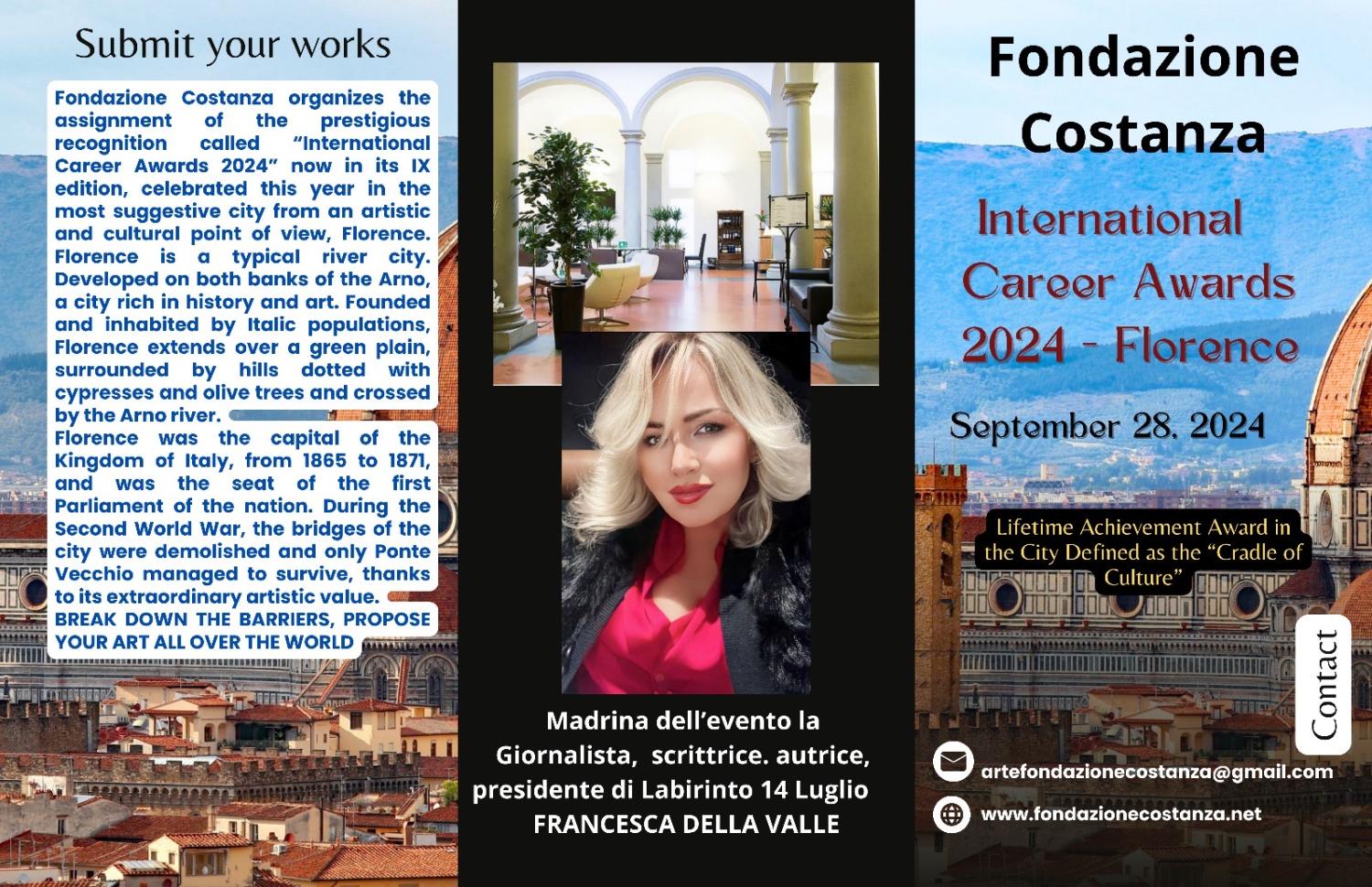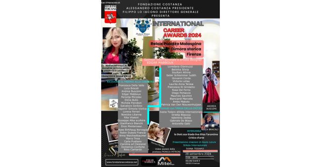 Fonazione Costanza sbarca a Firenze per l’International Awards 2024: il 28 settembre 2024 Alessandro Costanza presidente dell’associazione e Filippo Lo Iacono, artista internazionale nel ruolo di direttore generale, saranno insieme nella prestigiosa dimora storica di palazzo Malaspina oggi sede di un rinomato hotel in pieno centro a due passi dalla Cattedrale di Santa Maria Del Fiore. A curare la selezione degli artisti idonei al prestigioso premio alla carriera la dottoressa Giada Eva Elisa Tarantino, storico e critico d’arte a capo del comitato tecnico scientifico della Fondazione, milanese doc con un curriculum di altissimo livello e di grande professionalità, impegnata con altre importanti organizzazioni e grandi eventi di rilevanza internazionale. Novità di questa edizione consiste anche nel premiare il talento e la creatività ad artisti emergenti assegnando loro la targa della critica per l’impegno, la costanza e la forza di credere in quello che solitamente rappresenta un gioco una passione coltivata e sentita per diventare poi progetto di vita.