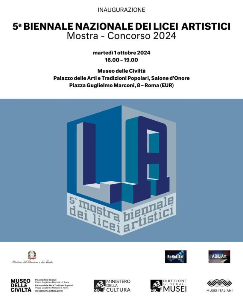 Il 1 ottobre 2024, dalle ore 16.00 alle ore 19.00, si inaugura presso il Museo delle Civiltà, a Roma, la 5°edizione della Biennale dei Licei Artistici. Il progetto, inserito nel Programma di Valorizzazione delle Eccellenze del Ministero dell’Istruzione e del Merito, è realizzata dall’Associazione Amici della Biennale dei Licei Artistici (ABiLiArt) con il supporto della Rete Nazionale dei Licei Artistici (ReNaLiArt). La mostra resterà aperta fino al 20 ottobre 2024.