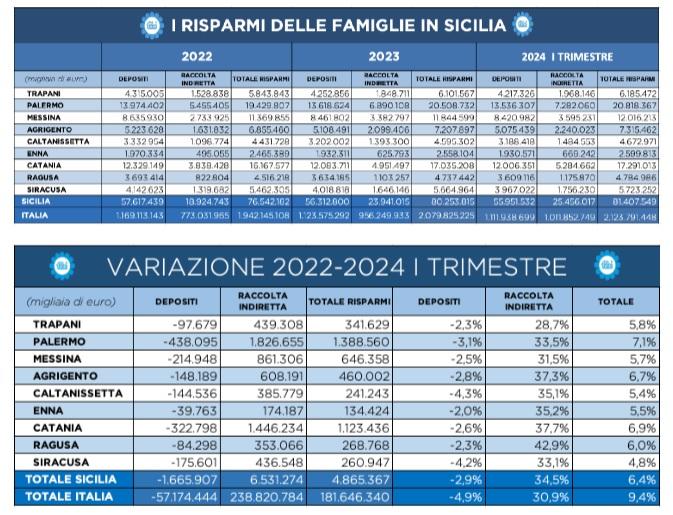 investimento, azioni, bond) di 1,8 miliardi ( +33,5%) e da un calo di 438 miliardi circa dei depositi( -3,1%). Anche nella provincia di Catania, se nel 2022 i risparmi delle famiglie ammontavano a 16,2 miliardi di euro, a fine marzo 2024 valevano 17,3 miliardi, con un incremento di 1,1 miliardi che rappresenta un +6,9%. Anche nel catanese protagonisti sono stati titoli di stato, fondi di investimento, azioni e bond che hanno segnato un +37,7%, mentre i depositi hanno segnato un –2,6%. A Messina si è registrato un incremento pari a 646 milioni di euro, portando i risparmi complessivi delle famiglie della provincia da 11,4 miliardi nel 2022 a superare i 12 miliardi (+5,7%).