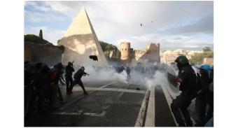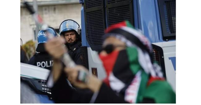 Anche un palo della segnaletica stradale è stato lanciato contro le forze dell'ordine che presidiano la piazza della manifestazione pro Pal. Il grosso dei manifestanti è arretrato. La polizia lancia lacrimogeni e usa gli idranti per disperdere i manifestanti violenti, molti incappucciati, mentre gli agenti sono bersagliati da bombe carta, sassi, mazze, pali della segnaletica stradale. In piazza è un fuggi dopo che si è scatenata un vera e propria guerriglia.