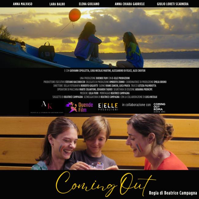 Il cortometraggio “Coming Out” della regista Beatrice Campagna, è stato proiettato alla VI Edizione dell’Aprilia Film Festival di Roma tenutosi il 21 e il 22 settembre 2024, vincendo il “Premio del pubblico Sabato” (https://cinecittanews.it/aprilia-film-festival-tutti-i-vincitori/). La produzione del corto è stata curata da Duende Film, una realtà del panorama cinematografico indipendente, che ha costruito solide collaborazioni con registi, attori e sceneggiatori di talento, arricchendo il proprio patrimonio creativo. Ogni progetto portato avanti è frutto di una combinazione unica di esperienza, innovazione e dedizione: l’obiettivo di Duende Film è quello di restituire forza comunicativa e ispirazione, partendo da un’esigenza espressiva. Le storie trattate hanno una loro identità e si propongono come esperienze uniche da ricordare per il pubblico. La distribuzione è nelle mani di Associak, una casa di distribuzione cinematografica indipendente nata nel 2012 ed impegnata nella diffusione artistica e commerciale di lungometraggi, documentari e cortometraggi nei principali festival nazionali.