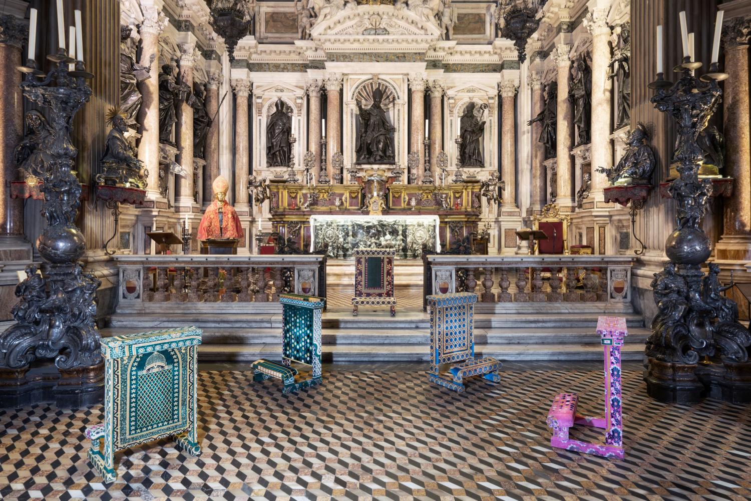 L’installazione Una Nuvola Come Tappeto accoglie il visitatore a partire dalla Real Cappella e consiste in 21 inginocchiatoi cattolici, arredi lignei liturgici allestiti lungo l’intero percorso di visita come “filo conduttore” dell’esposizione. Realizzati sul modello di un inginocchiatoio presente nel Duomo di Napoli, sono interamente rivestiti da coloratissimi tessuti di tappeti per la preghiera musulmana. Il titolo dell’opera è tratto dal testo di Erri De Luca, che traduce dall'ebraico il versetto 39 del Salmo 105 «dove si canta Dio che guida gli Ebrei nel deserto». Un lavoro che unisce le tre religioni monoteiste in un’unica opera, un singolo oggetto appartenente alla tradizione religiosa, che oggi arriva per la prima volta in Italia, precedentemente presentato al Kunstmuseum di Lucerna nel 2019.