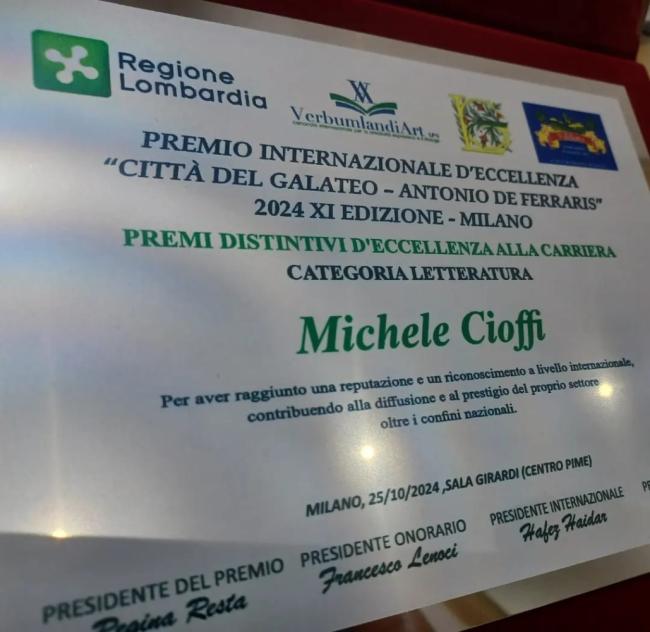 Un nuovo straordinario traguardo raggiunto dallo scrittore e aforista di Nettuno Michele Cioffi. A Milano, nella Sala Girardi del Centro Pime, gremita di autorità internazionali nel mondo della letteratura, dell'arte, della politica e della medicina, è stato insignito del Premio Distintivo d'Eccellenza alla Carriera nella categoria letteratura con la seguente motivazione"