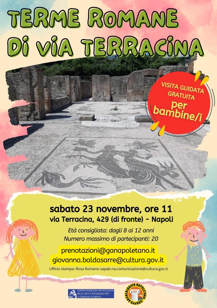 La Soprintendenza Archeologia, Belle Arti e Paesaggio per il Comune di Napoli ha previsto l’apertura straordinaria dei luoghi in collaborazione con il Gruppo Archeologico Napoletano. La visite guidate gratuite al Sito Archeologico delle Terme Romane di via Terracina di Napoli verranno effettuate sabato 9 e domenica 17 novembre dalle 09.00 alle 13.00, con turni di visita ore: 10.00 - 11.00 - 12.00. Per prenotare la visita occorre scrivere a info@ganapoletano.it. In occasione dell’apertura straordinaria delle Terme Romane sabato 23 novembre, dalle 11 alle 12, ci sarà una visita guidata gratuita per bambini e bambine, poiché il numero massimo di partecipanti è di 20 occorre prenotare scrivendo a giovanna.baldasarre@cultura.gov.it o prenotazioni@ganapoletano.it (Gruppo Archeologico Napoletano che si occuperà di organizzare il gruppo fino al raggiungimento del numero massimo di partecipanti).