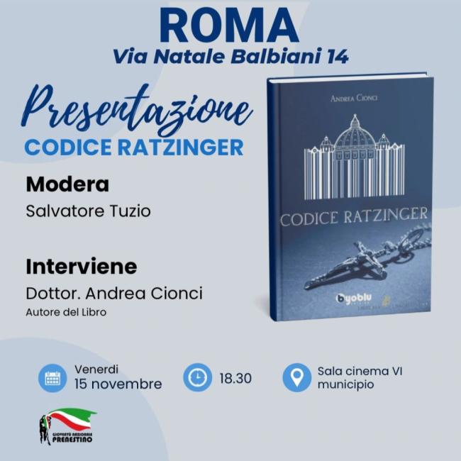 Scopritore della sede impedita e del codice comunicativo di Sua Santità Benedetto XVI costretto in “sede impedita”, alla fine di maggio 2022 Andrea Cionci ha pubblicato il Libro-inchiesta “Codice Ratzinger” che riassume il lavoro di oltre due anni di indagini, oltre 1000 articoli e 1197 podcast, lavoro avallato da insigni studiosi italiani e stranieri.