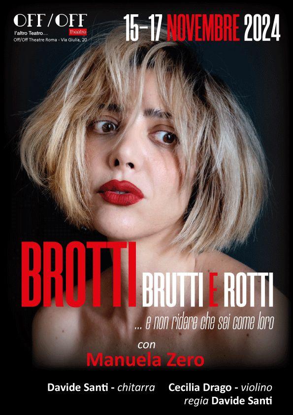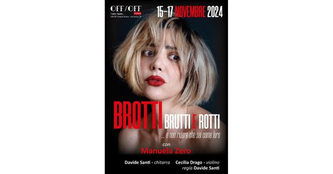 Dal 15 al 17 novembre l’Off/Off Theatre di Roma ospiterà “Brotti! E non ridere che sei come loro”, l’innovativo progetto teatrale multimediale, con musica dal vivo, ideato, scritto e composto da Manuela Zero (protagonista in palcoscenico) e Davide Santi (che firma la regia). La musica è suonata live dallo stesso Davide Santi alla chitarra e da Cecilia Drago al violino.