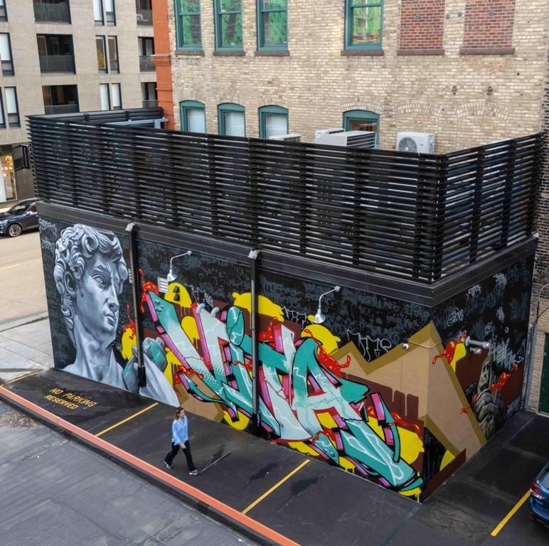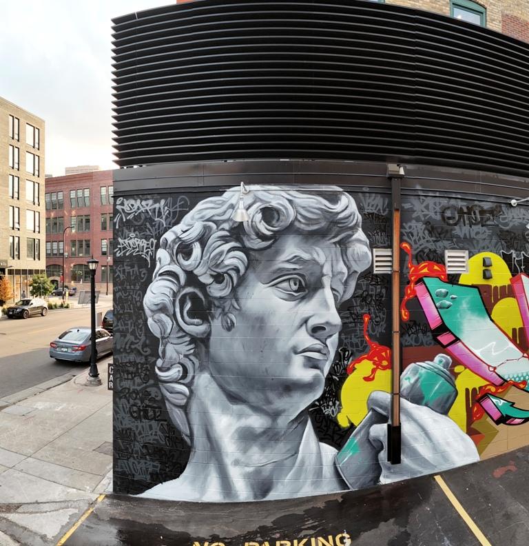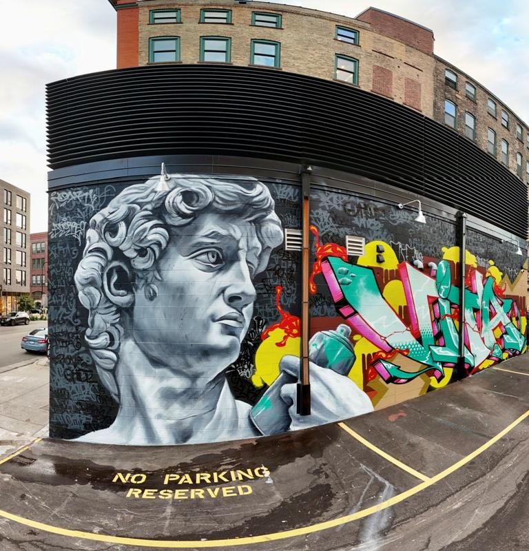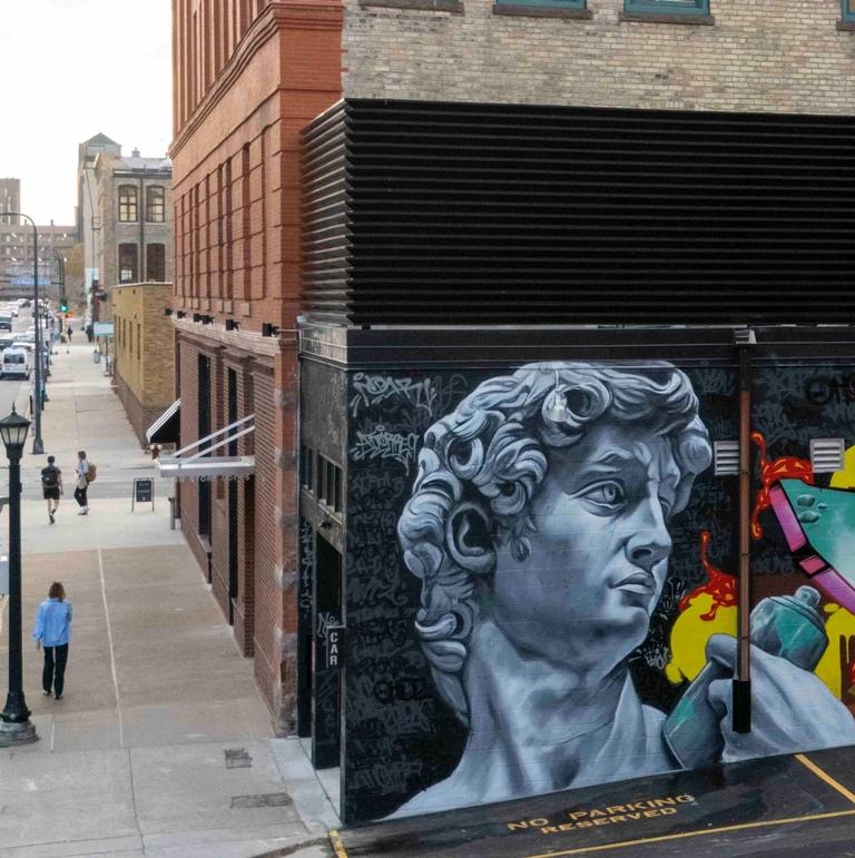 In un parcheggio fuori dalla 2nd Avenue, nel vivace e avanguardistico quartiere North Loop, il professore Francesco Parisi ha intravisto il potenziale per compiere una rigenerazione urbana, valorizzando il distretto attraverso l’inserimento di nuove opere di street art dal forte impatto visivo.