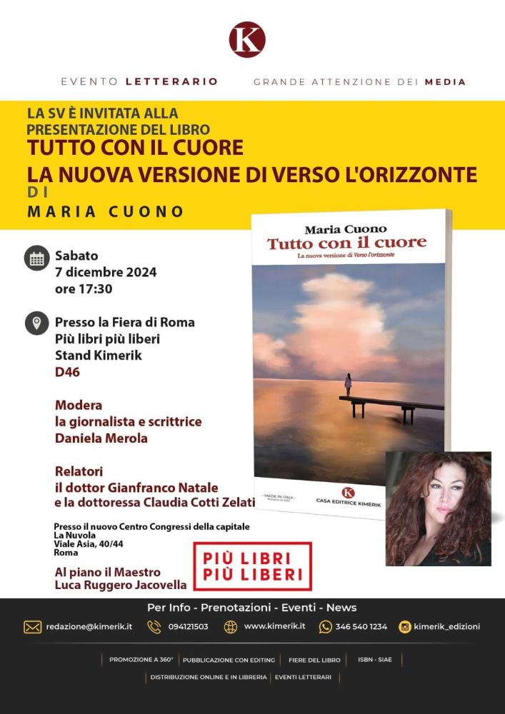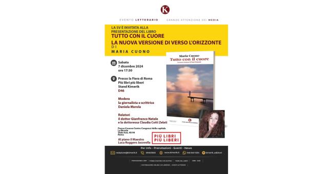 Sabato 7 dicembre alle ore 17.30, si terrà presso la fiera di Roma Più Libri più liberi, Stand Kimerik D46, in Via Asia 40/44, presso il nuovo Centro Congressi della capitale La Nuvola, la presentazione del libro di Maria Cuono, giornalista, scrittrice, docente di materie letterarie, dal titolo Tutto con il cuore. La nuova versione di Verso l’Orizzonte, edito dalla Casa Editrice Kimerik. La Prefazione è a cura del soprano Olga De Maio.