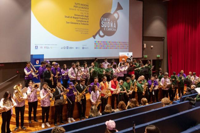 “Canta, Suona e Cammina” rappresenta il cuore dell’iniziativa Musica nei Luoghi Sacri, nata dalla collaborazione tra la Curia Arcivescovile di Napoli e la Regione Campania che promuove l’iniziativa attraverso Scabec (fondi POC 2014-2020, edizione 2023/2024 DGR 564/2022), che ne coordina le attività, e la Fondazione Fare Chiesa e Città, responsabile della curatela scientifica e del raccordo con le parrocchie. Grazie al progetto, 350 giovani musicisti hanno la possibilità di entrare a far parte di 8 bande musicali locali, selezionati tra le parrocchie dei quartieri più esposti al disagio giovanile di Napoli e nei comuni di Afragola, Ercolano e Pompei, dove le difficoltà educative e sociali sono particolarmente presenti. Questo percorso musicale rappresenta un’opportunità concreta per aiutare i ragazzi a trovare una strada positiva, rispondendo alle esigenze di supporto e crescita individuale in contesti di fragilità.