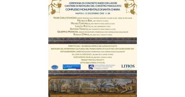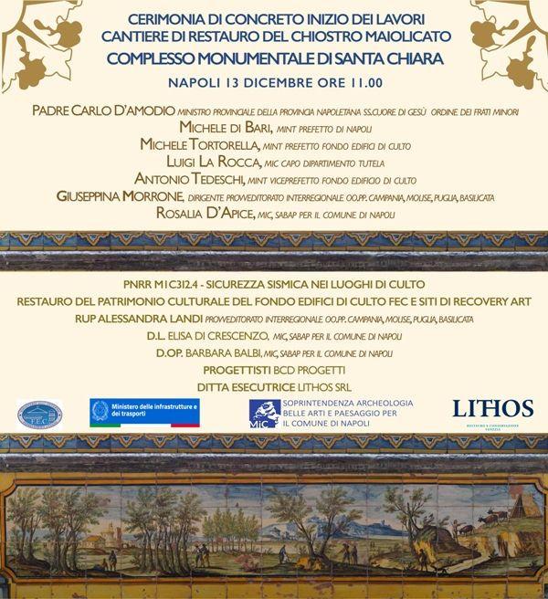 L’evento della cerimonia di inizio dei lavori rappresenta solo l’inizio di una fase di nuove progettualità, che si inquadra in un complessivo disegno volto alla ristrutturazione del patrimonio culturale e artistico di interesse religioso del FEC del Ministero dell’Interno. All’evento erano presenti: il Capo Dipartimento della Sovrintendenza speciale per il PNRR, Luigi La Rocca; il funzionario delegato alla Soprintendenza Archeologica Belle Arti e Paesaggio per il Comune di Napoli Rosalia D’Apice; il Vice Prefetto Antonio Tedeschi della Direzione Centrale del Fondo Edifici di Culto del Ministero dell’Interno; il delegato del Provveditorato alle Opere Pubbliche, Giuseppina Morrone e Padre Carlo D’ Amodio ministro della Provincia napoletana SS. Cuore di Gesù. Il Prefetto ha evidenziato che il progetto riveste un significato speciale per la città di Napoli, tenuto conto dell’importanza del complesso monumentale, unico al mondo, contraddistinto da particolare pregio artistico e storico. Il Capo Dipartimento della Sovrintendenza speciale per il PNRR ha svolto una panoramica generale sugli interventi di funzionalizzazione e restauro degli edifici sacri finanziati dal PNRR. Nello specifico, il finanziamento dei lavori inaugurati presso il complesso di S. Chiara, riguardano il chiostro maiolicato e il ripristino del pergolato storico, per un quadro economico complessivo di circa 2.000.000 di Euro. Il ministro della Provincia napoletana SS. Cuore di Gesù ha espresso la propria soddisfazione per l’avvio di tale progetto che rappresenta un ulteriore passo avanti nel percorso di avvio di interventi finanziati per la restituzione degli edifici religiosi alla piena fruibilità di cittadini e turisti. Tutti i presenti hanno concordato sull’utilità della sinergia attuata tra i diversi attori istituzionali per la buona riuscita del programma di restyling delle opere. Il Prefetto ha ricordato che l’avvio dei lavori si inserisce nel percorso virtuoso attuato con i fondi PNRR, Missione C3 - Investimento 2.4 “Sicurezza sismica nei luoghi di culto, restauro del patrimonio FEC e siti di ricovero per le opere d’arte restauro patrimoniale culturale”.