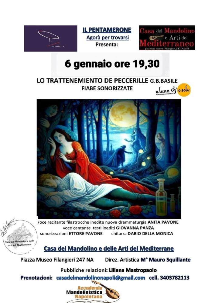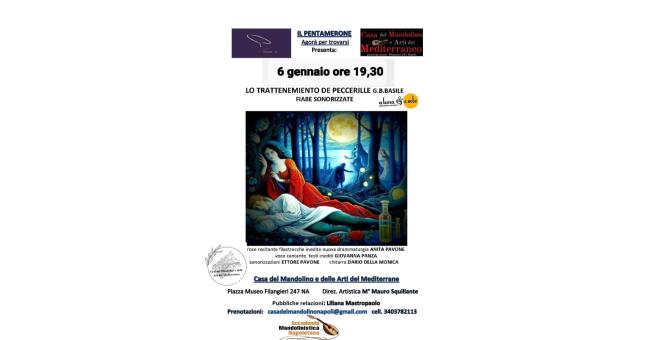 La Casa del Mandolino e delle Arti del Mediterraneo è lieta di accogliere nella suggestiva sede di Piazza Museo Filangieri, un progetto artistico di grande prestigio, una performance caratterizzata dall' amalgama perfetta di diverse discipline artistiche; narrazione, esecuzione musicale , canto, per uno spettacolo che omaggia uno dei più grandi esponenti della letteratura, della storia, della tradizione e della cultura campana e non solo, Gian Battista Basile.