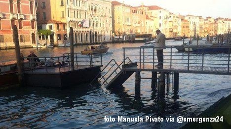 Molto spavento ma nessuna conseguenza fisica per gli sfortunati ospiti della Fondazione Prada a Venezia, dove il pontile allestito sul Canal Grande è improvvisamente ceduto al loro passaggio, facendoli finire in acqua.