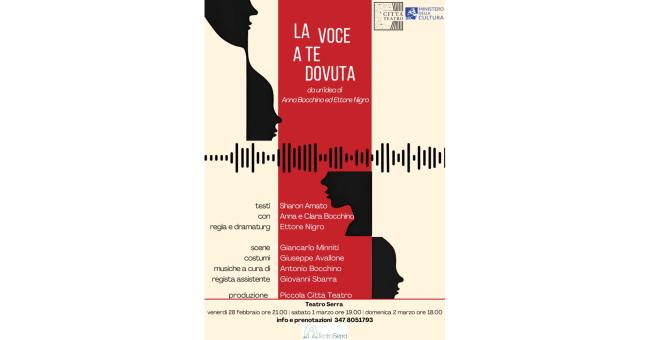 Con “La voce a te dovuta” il Teatro Serra di Napoli ospita una riflessione donne ed educazione alla discriminazione. Una produzione Piccola Città Teatro. Regia Ettore Nigro. Con Anna e Clara Bocchino. Testi Sharon Amato. Scene Giancarlo Minniti. Costumi Giuseppe Avallone. Musiche Antonio Bocchino. Regista assistente Giovanni Sbarra. Dal 28 febbraio al 2 marzo (venerdì ore 21:00, sabato ore 19:00, domenica ore 18:00) a Fuorigrotta, in Via Diocleziano 316. Info: teatroserra@gmail.com, 347.8051793.