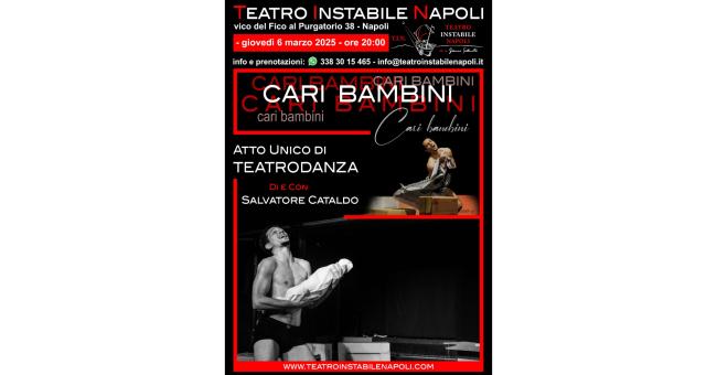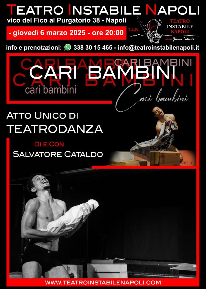 “CARI BAMBINI” sbarca in Italia come tappa fondamentale di una tournée internazionale tra Europa e Medio Oriente. Dopo El Cairo ed Istanbul, infatti, giovedì 6 marzo alle 20.00, arriva al Tin-Teatro Instabile Napoli. Lo spettacolo di teatrodanza è scritto ed interpretato dal performer Salvatore Cataldo. La pièce è un dolce grido che irrompe in un profondo silenzio. Un grido all'umanità che racconta la posizione di un artista di fronte ad una catastrofe.