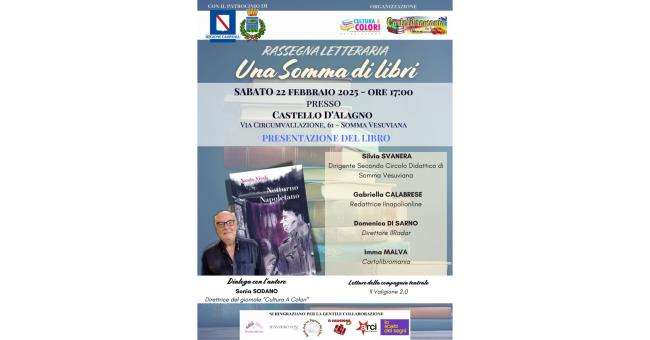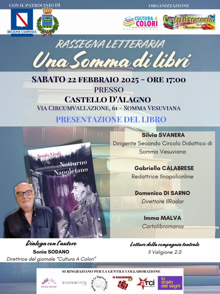 Prosegue con grande entusiasmo la rassegna letteraria organizzata da “Cartolibromania” e “Cultura a Colori” dal titolo “Una somma di libri”, che ospiterà presso il Castello d'Alagno, (in via Circumvallazione 61 a Somma Vesuviana), la presentazione del libro “Notturno Napoletano” di Nando Vitali, edito da Colonnese. L'evento, patrocinato dalla Regione Campania e dal Comune di Somma Vesuviana, si terrà sabato 22 febbraio alle ore 17:00 e si preannuncia come un'occasione imperdibile per gli appassionati di letteratura e cultura.