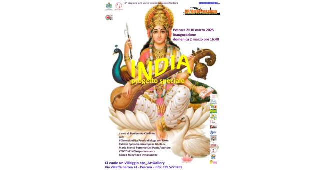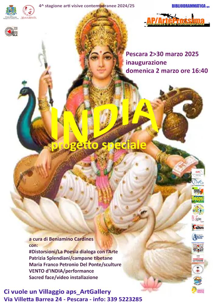 Domenica 2 marzo dalle ore 16:40, inaugurazione del progetto speciale “INDIA - mostra performance poesia video” a cura di Beniamino Cardines e SU/Sintassi Urbane rivista letteraria. Promossa da Bibliodrammatica aps e AP/ArteProssima progetto #npittic, nell’ambito della 4^ stagione di arti visive contemporanee #arteovunque, col Patrocinio del Comune di Pescara. In collaborazione con MLA/Museo Lettera d’Amore.