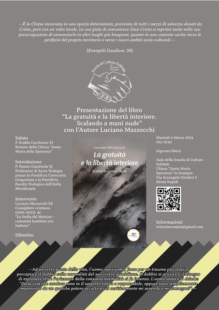 Gli incontri della “Scuola di cultura solidale” a Scampia giungono al primo anniversario. Un anno fa, nel marzo del 2024, cominciava un percorso di presentazione di libri orientato a sensibilizzare la cittadinanza di Napoli nel condividere la cultura consapevole dell’urgenza della solidarietà sociale. La scelta di ospitare le presentazioni, in presenza degli autori, a Scampia, fu dettata dalla volontà di posizionarsi in un luogo emblematico di emarginazione sociale. In questo appuntamento ospiteremo Luciano Mazzocchi SX, padre Missionario Saveriano, consigliere cristiano (2001-2023) de “La Stella del Mattino - comunità buddista zen italiana” e co- fondatore, con il monaco Zen Jiso Forzani, dell’Associazione “Vangelo e Zen”. La gratuità e la libertà interiore. Scalare a mani nude, (2024, Europa Edizioni), è l’ultima opera dell’Autore, attualmente cappellano della comunità cattolica giapponese dell’arcidiocesi di Milano. Un libro dedicato ai giovani, lavoratori e universitari, “che scelgono di scalare la montagna dei loro ideali a mani nude.” Pensieri offerti “come incoraggiamento e conforto per quando la roccia viva fan della mano nuda e, in quel momento di dolore, il richiamo alla vita piatta e comoda, sottovoce, lusinga.” Info e contatti: Chiesa “Santa Maria Speranza” in Scampia Via Arcangelo Ghisleri 5, 80144 Napoli 329 633 83333 – rettoriascampia@gmail.com www.chiesasmsperanza.it/scuola-cultura-solidale-2 Ingresso libero