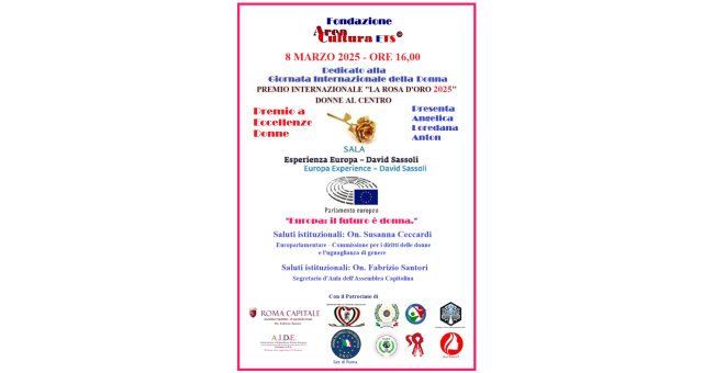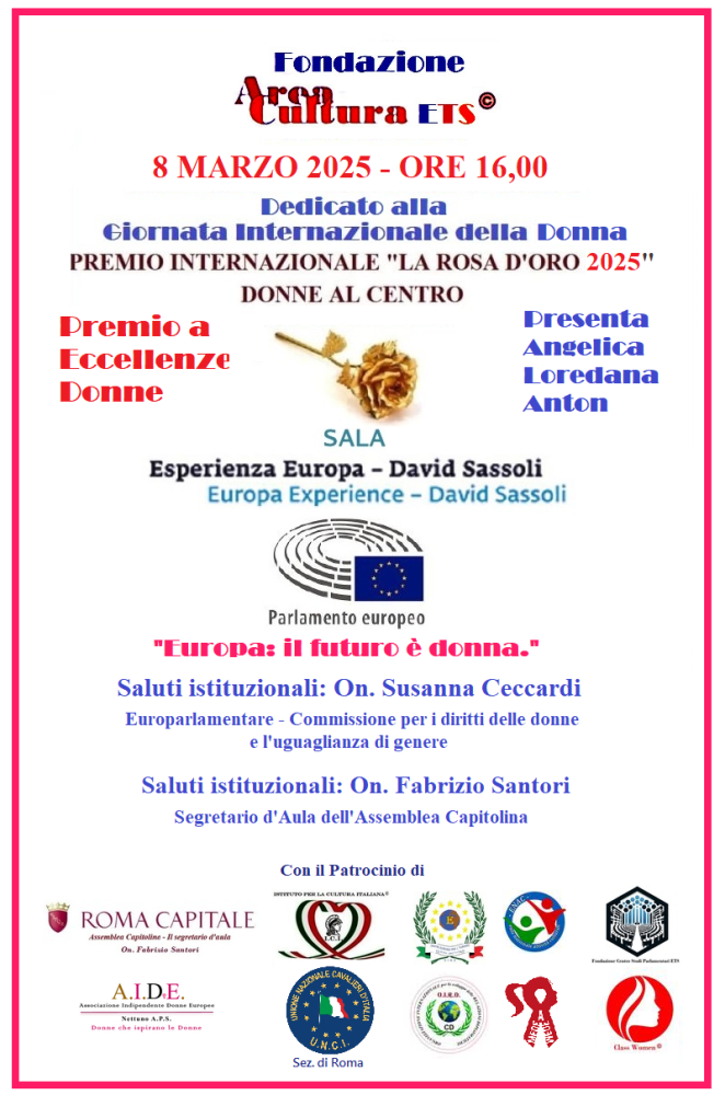 L’evento di premiazione si svolgerà nella prestigiosa Sala David Sassoli del Parlamento Europeo a Piazza Venezia, Roma, il prossimo 8 marzo 2025, ore 16,00, in occasione della Giornata Internazionale della Donna, per celebrare e riconoscere l’eccellenza femminile.