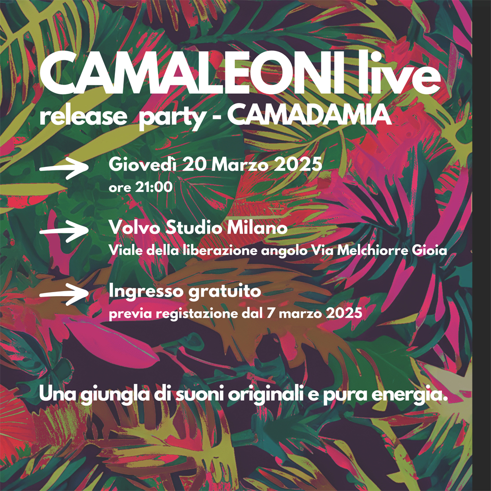 CAMADAMIA è molto più di un semplice primo disco: è un manifesto musicale, una giungla sonora che riflette l'identità caleidoscopica della band. Ogni brano è originale, firmato e arrangiato dai Camaleoni stessi, e restituisce l'energia travolgente e la creatività senza filtri che da sempre caratterizzano il loro sound. Fusion, jazz contemporaneo, funk e rock moderno si mescolano in uno stile inconfondibile: quello CAMAleonico.