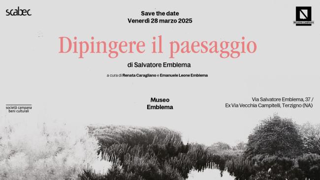 Venerdì 28 marzo, alle ore 17.00, al Museo Emblema di Terzigno (NA) sarà inaugurato il progetto espositivo “Dipingere il paesaggio", a cura di Renata Caragliano ed Emanuele Leone Emblema, programmato e finanziato dalla Regione Campania (Fondi POC 2021-2027), realizzato da Scabec nell’ambito della rassegna Campania by Night, con il Museo Emblema.