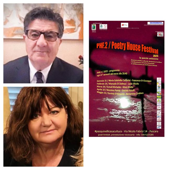 Venerdì 28 marzo 2025 (ore 20:40) a Pescara in #pasquinellicasacultura, dopo lo straordinario successo della prima edizione, la cultura si riaccende con il PHF.2/Poetry House Festival (le parole uniscono). Un ricco programma composto da cinque serate e due progetti speciali. Il festival di poesia andrà avanti fino a maggio e ospiterà nomi eccellenti della nuova scrittura italiana contemporanea, e scrittori e scrittrici emergenti. Ospiti della terza serata Esmail Mohades (giornalista, scrittore, conferenziere internazionale, testimone della primavera iraniana) e Mara Motta (docente, poetessa, promotrice culturale). Il PHF.2 è patrocinato dal Comune di Pescara e dalla Provincia di Pescara. Con gli auspici del CEPELL/Centro per il Libro e la Lettura del Ministero della Cultura. In collaborazione con il MLA/Museo Lettera d’Amore.