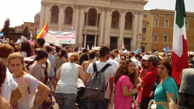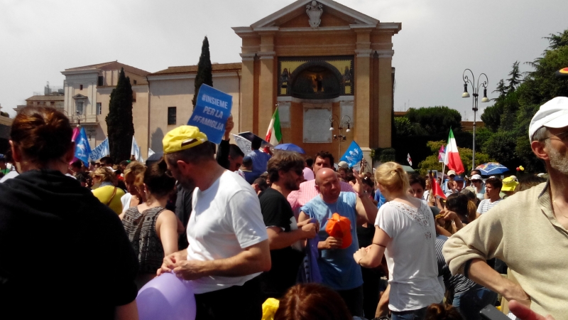 A Roma in piazza San Giovanni e distribuiti altresì su via Merulana (da cui spiccava uno striscione su cui era scritto”Siamo qui per amore dei nostri figli”) e via Santa Croce, prima sotto un grosso acquazzone e poi sotto il sole, oltre un milione di persone erano lì per manifestare contro l’ideologia Gender nelle scuole.